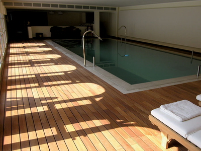 Important! Un substitut moins cher au teck peut être le mélèze, qui n'est que légèrement inférieur dans ses caractéristiques à un arbre exotique. Vous pouvez également réduire le coût du travail en utilisant un stratifié résistant à l'humidité. Lors de l'achat de ce revêtement de sol, vous devez faire attention à la présence de marquages indiquant son adéquation pour les pièces à forte humidité.