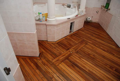 Le matériau naturel idéal pour le revêtement de sol dans la salle de bain est le teck, utilisé depuis longtemps dans la construction navale. Le bois de teck contenant une grande quantité de résines et d'huiles essentielles est étanche. Le platelage en teck (platelage) n'est pas sensible à la pourriture et aux dommages causés par les champignons, les moisissures et les insectes. Le matériel est importé d'Indonésie et vendu dans les supermarchés de la construction.