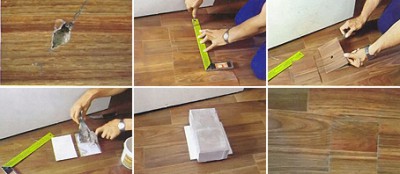 La base du site de réparation est nettoyée de la poussière et lubrifiée avec du mastic, un patch y est appliqué et pressé avec quelque chose de solide. La fixation du matériau lors de la réparation avec des clous n'est pas recommandée - cet endroit sera trop visible. Pour éliminer les petites fissures et irrégularités sur le linoléum, ainsi que sur les carreaux en chlorure de polyvinyle, un mastic spécial est utilisé. Il est vendu dans les quincailleries. Bien que, dans ce même but, vous puissiez cuisiner vous-même un mastic très efficace selon cette recette: