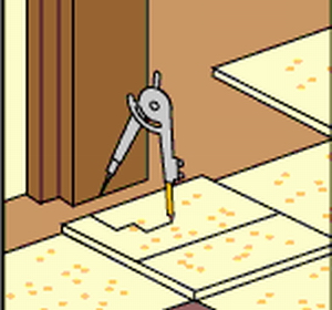 Pour couper des carreaux situés près des cadres de porte, utilisez une boussole. Cet outil, connu de tous depuis l'école, permet d'obtenir un contour. Une tuile de mur est soigneusement coupée le long du contour marqué.