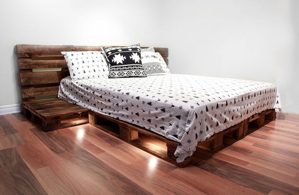 Un sujet distinct - lits de palettes. La conception en treillis vous permet d'utiliser l'espace sous le lit pour le stockage. Ou vous pouvez jouer avec la lumière, faisant briller le podium sous le matelas.