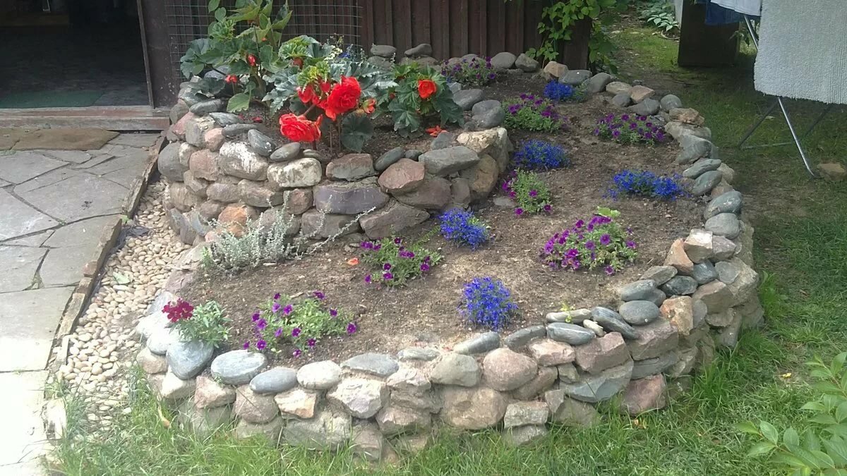 Il n’est pas difficile de pierre un lit de récipient avec des plantes plantées dans de vieux bassins avec des pierres.