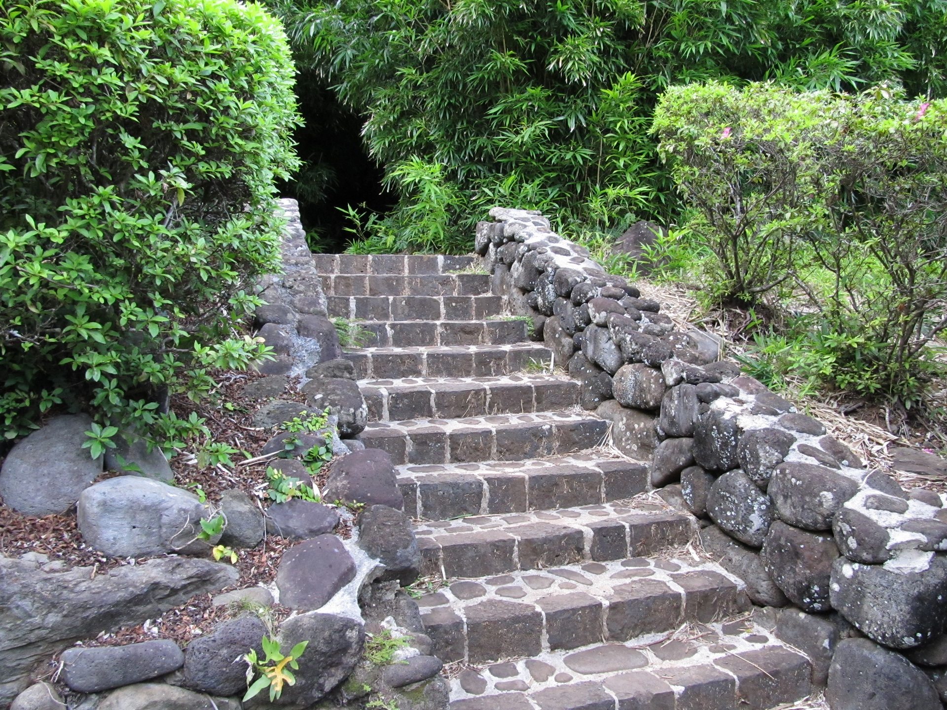Les murs de soutènement et les escaliers en pierre dureront longtemps et empêcheront les glissements de terrain dans la zone à terrain complexe.