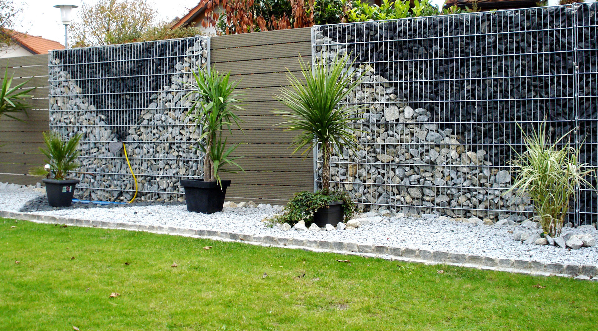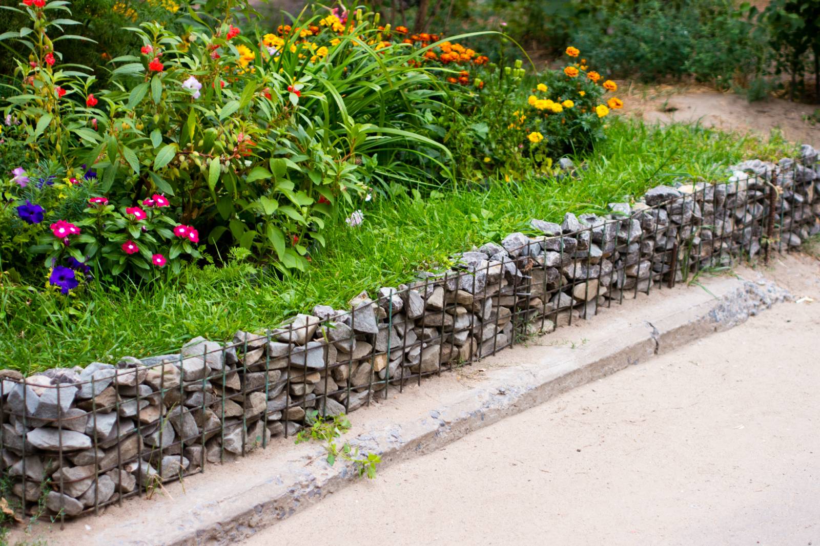 Une méthode nouvelle pour décorer un chalet d'été est l'utilisation de gabions. C'est ce qu'on appelle la conception du cadre en maille d'acier, bourré de pierres. La taille et la forme de la charge n'ont pas d'importance - la pierre concassée industrielle et les cailloux naturels conviennent. La création de clôtures de grande taille autour du périmètre du site est mieux commandée par des professionnels, et la fabrication de bordures basses ou de cloisons pour le zonage du territoire peut être réalisée par vos propres mains et artisans.