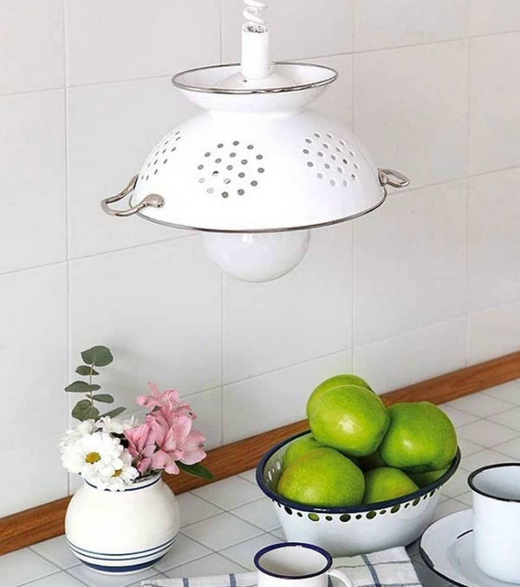 Les appliques murales des passoires colorées ne sont pas trop lumineuses, mais très pittoresques. Pour ce décor, des articles de tout style et de tout âge conviennent, qui, si vous le souhaitez, peuvent être mis à jour avec de l'émail acrylique multicolore.