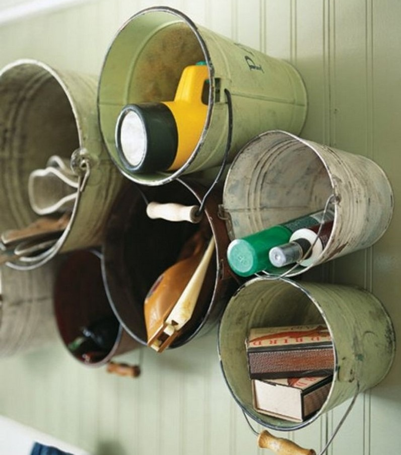 Dans une maison d’été, il est plus facile de mettre les choses en ordre si les outils de jardin et les engrais sont placés dans une structure suspendue de fortune à partir de vieux seaux.
