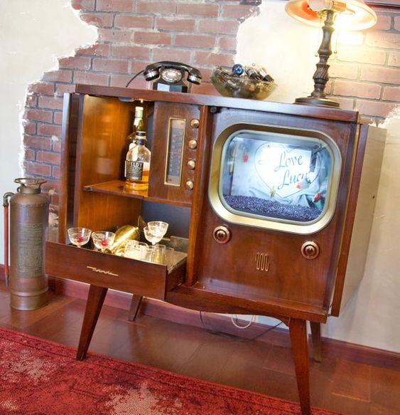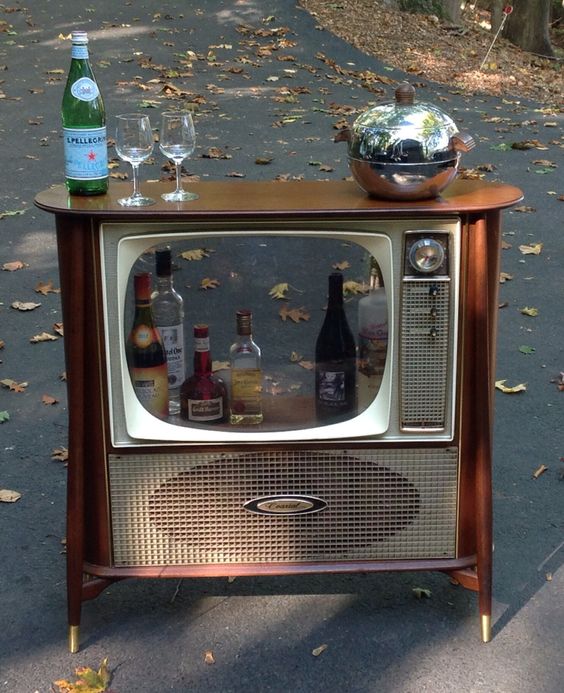 Vous pouvez également faire un minibar de la télévision. Le principe de fabrication d'un tel élément intérieur est le même que dans la fabrication de l'aquarium: retirer les pièces internes et laisser la caisse en bois.
