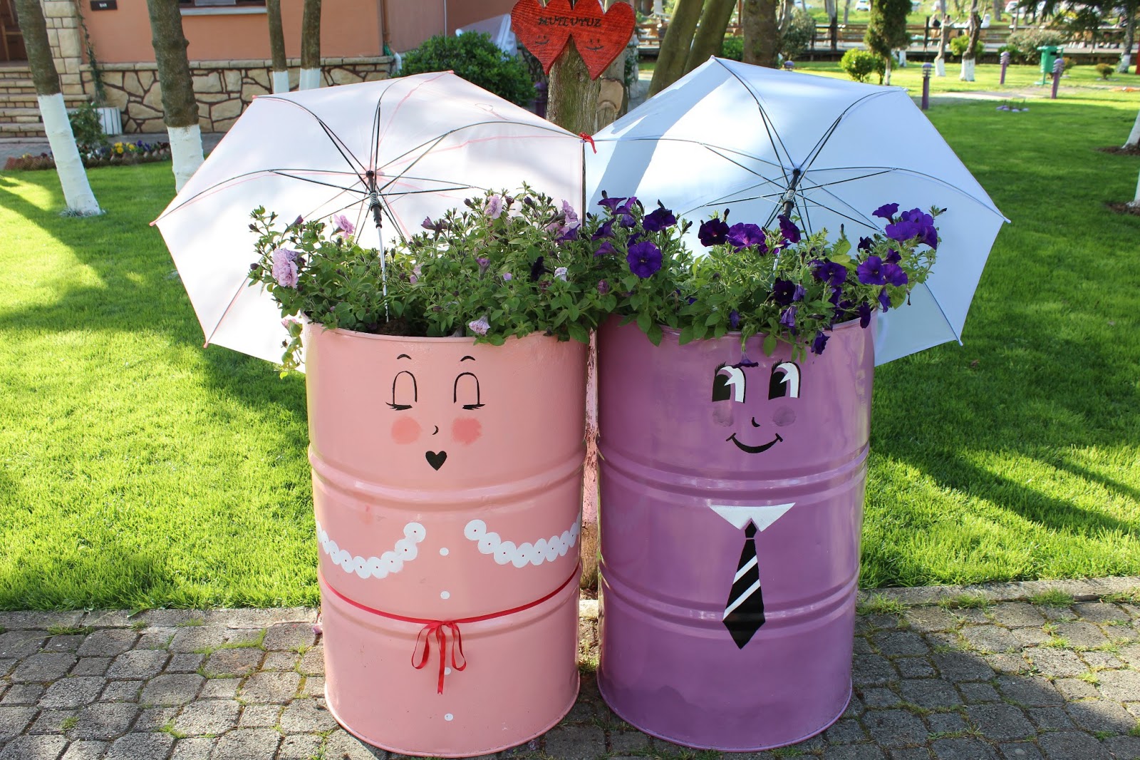 Le jardin fleuri pittoresque peut être complété par un «toit», qui protégera de la pluie ou de la lumière directe du soleil. La couleur du parapluie doit être en harmonie avec les nuances du parterre de fleurs.