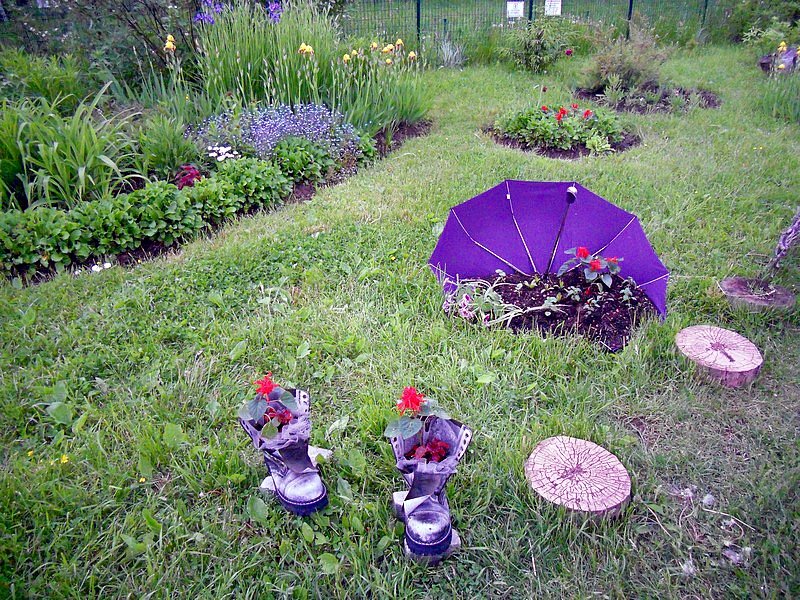 Les plantes à système racinaire peu profond sont plantées dans n'importe quel contenant de terre. Pour créer un parterre de fleurs mobile coloré, des parapluies avec un cadre solide et un tissu intact sont choisis. À la fin de la saison, un stand lumineux peut être déplacé dans une pièce fermée où les fleurs hiverneront et pourront à nouveau décorer le site avec l'arrivée de la chaleur.