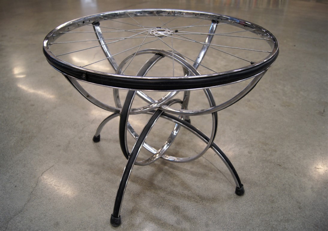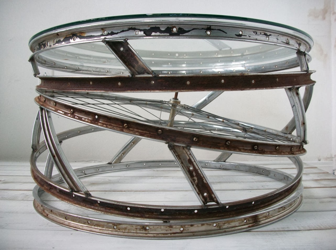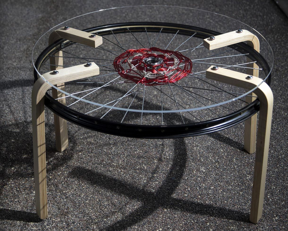 La construction de la roue, du verre (de préférence organique) et des pieds de l'ancien tabouret est assemblée à l'aide de boulons.