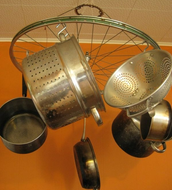 Les ustensiles de cuisine accrochés à un support de roue de vélo seront toujours à portée de main avec l'hôtesse. Cette conception remplacera facilement les conceptions d'usine coûteuses.