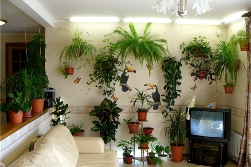 Beaucoup de petits pots de fleurs rendent l'intérieur de la pièce ennuyeux et insipide.Par conséquent, il est préférable de décorer le salon avec un ou deux grands pots, ce qui sera suffisant pour créer une atmosphère chaleureuse.