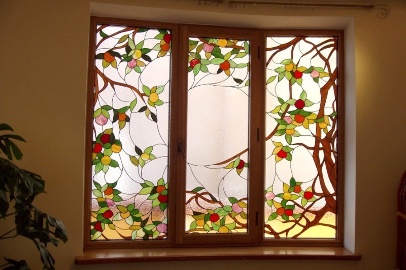 Si la pièce est orientée au sud et est entourée de soleil, il n'est pas nécessaire d'accrocher des rideaux occultants à la fenêtre. Le verre peut être peint à l'acrylique en utilisant la technique du vitrail. Il est important de choisir la bonne image. Il peut s'agir d'un ornement floral ou géométrique, de fleurs ou d'abstraction. Les nuances doivent être choisies en fonction de la palette de couleurs de l'intérieur et du style de sa conception.