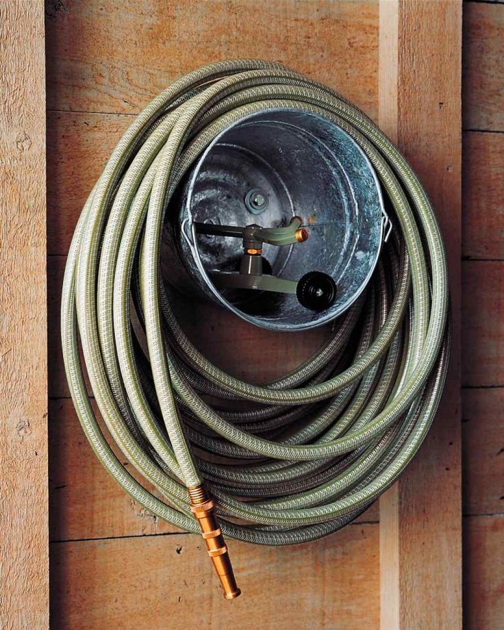 Bien sûr, il est préférable de plier le tuyau en anneaux - de cette façon, il ne se mélangera pas. Vous pouvez lancer les bobines sur un support monté sur un mur. Un vieux seau ou un trajet en voiture suffira. Il est pratique d'utiliser le seau en plus comme étagère et de le placer, par exemple, des gants de jardin ou d'autres outils.