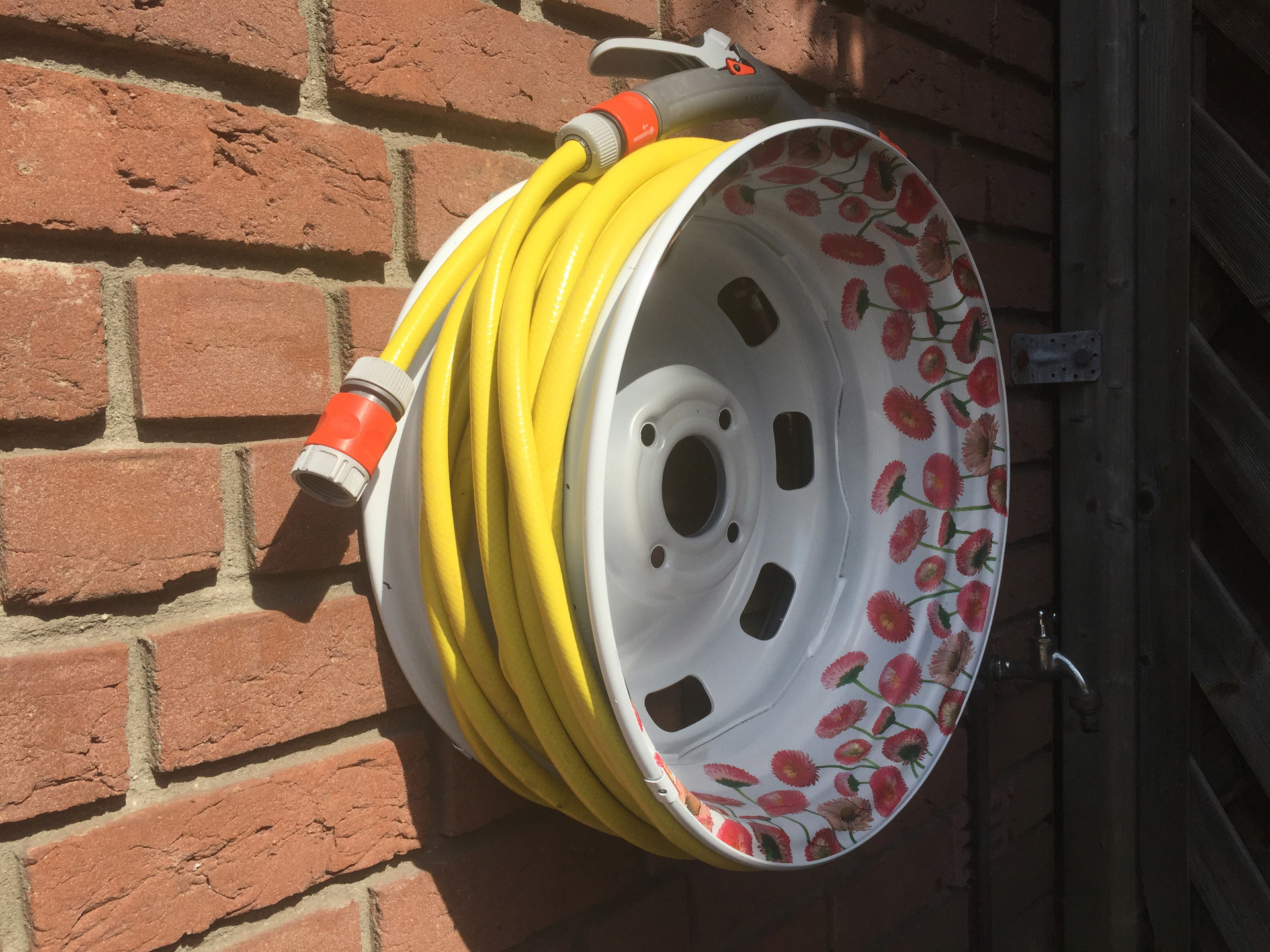 S'il n'y a pas de grosse bobine, vous pouvez fixer plusieurs petites couleurs contrastées sur le mur et enrouler le tuyau autour d'elles: cela s'avérera non seulement pratique, mais aussi très inhabituel.