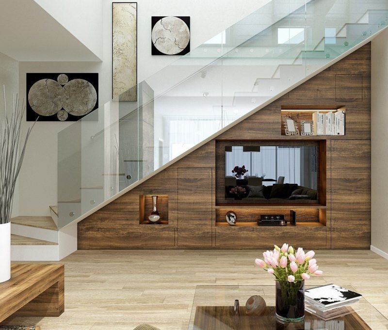 Le choix de la destination du lieu sous l'escalier dépend de l'imagination et du désir des propriétaires. Les seules choses à considérer au stade de la planification sont la zone disponible, les caractéristiques de conception et l'emplacement des escaliers.