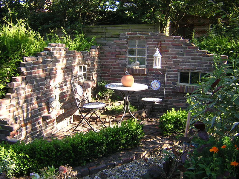 Les ruines décoratives sont un nouveau mot dans la conception d'un jardin de campagne. Des murs de briques pittoresques créent un coin confortable pour la détente.