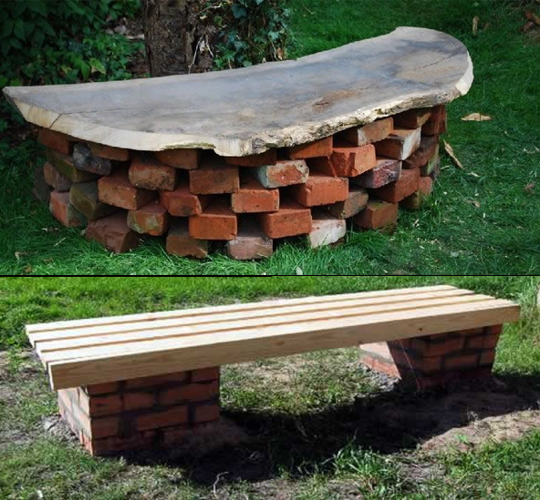 Les briquettes de brique sont bonnes pour créer des meubles de jardin - bancs et tables. Le matériau est combiné avec du bois et de la pierre.