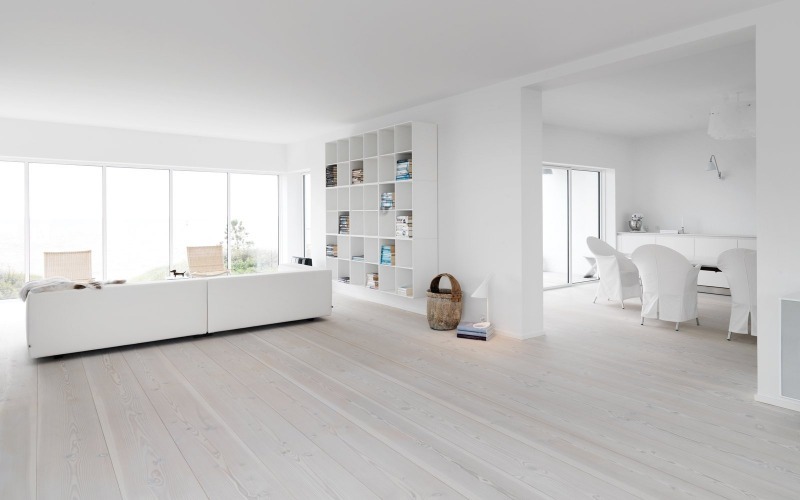 Les concepteurs conseillent de choisir non pas un blanc pur pour le sol, mais un gris blanchi, laiteux, beige, avec un aspect et des éraflures antiques. Ils seront tout aussi brillants, mais plus nobles, classiques et confortables.