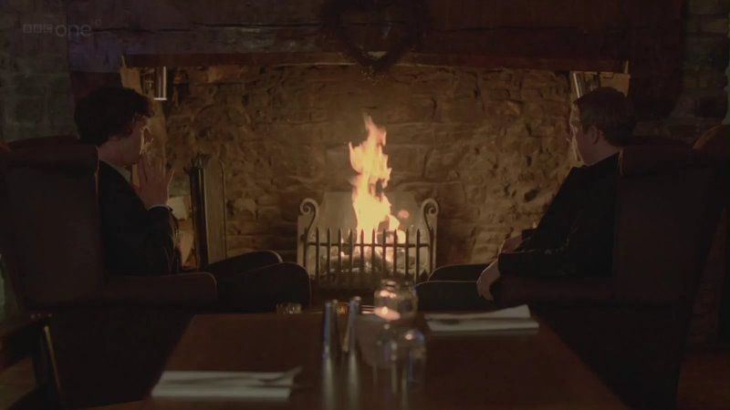 Sur l'écran du téléviseur, nous voyons une vraie cheminée avec un feu réel. Tout le monde ne peut pas se permettre d'installer une telle cheminée dans un appartement, elle peut donc être décorative. Une bonne option est une imitation électrique avec une image de flamme. Il ne donne pas de chaleur, mais permet d'apporter une atmosphère de confort à la pièce. Bien sûr, il devrait être équipé d'une cheminée, où les jours normaux, Sherlock accumule des factures pour un appartement et de la poussière qu'il n'avait pas l'habitude d'essuyer.