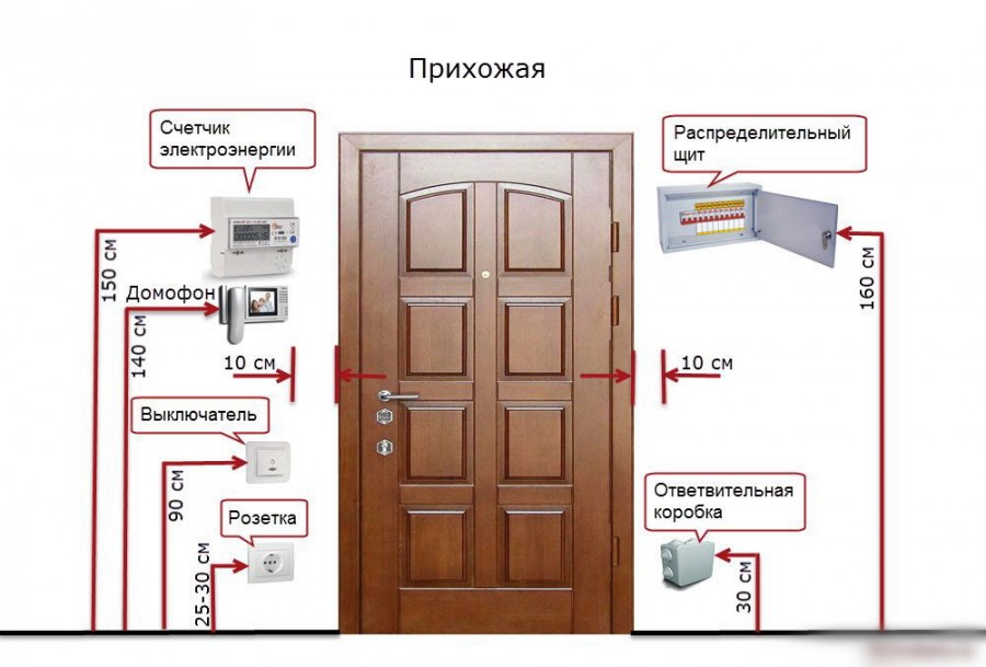 L'éclairage dans le couloir est mieux connecté à l'aide d'interrupteurs séparés. Le plus souvent, un sèche-chaussures ou un aspirateur sont utilisés dans cette pièce. Par conséquent, deux prises situées dans un coin à une hauteur de 30 cm du sol et de 10 cm de la porte ou du meuble suffiront. Si vous devez installer des appareils électriques supplémentaires dans le couloir, le circuit devient plus compliqué.
