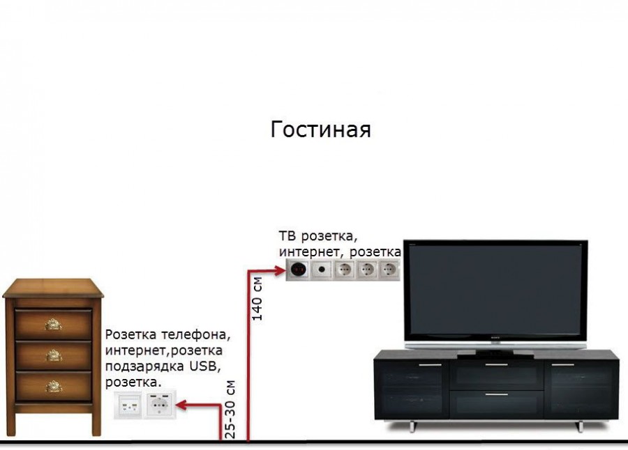 Cette salle est utilisée pour les loisirs et les divertissements pour les ménages, elle dispose d'une télévision, d'un centre audio, d'un routeur Wi-Fi, d'un système partagé, de points d'éclairage locaux. Ces appareils sont connectés en permanence, leurs prises sont montées selon les règles de sécurité à une hauteur de 30 cm du sol et d'au moins 10 cm des ouvertures de portes et fenêtres.