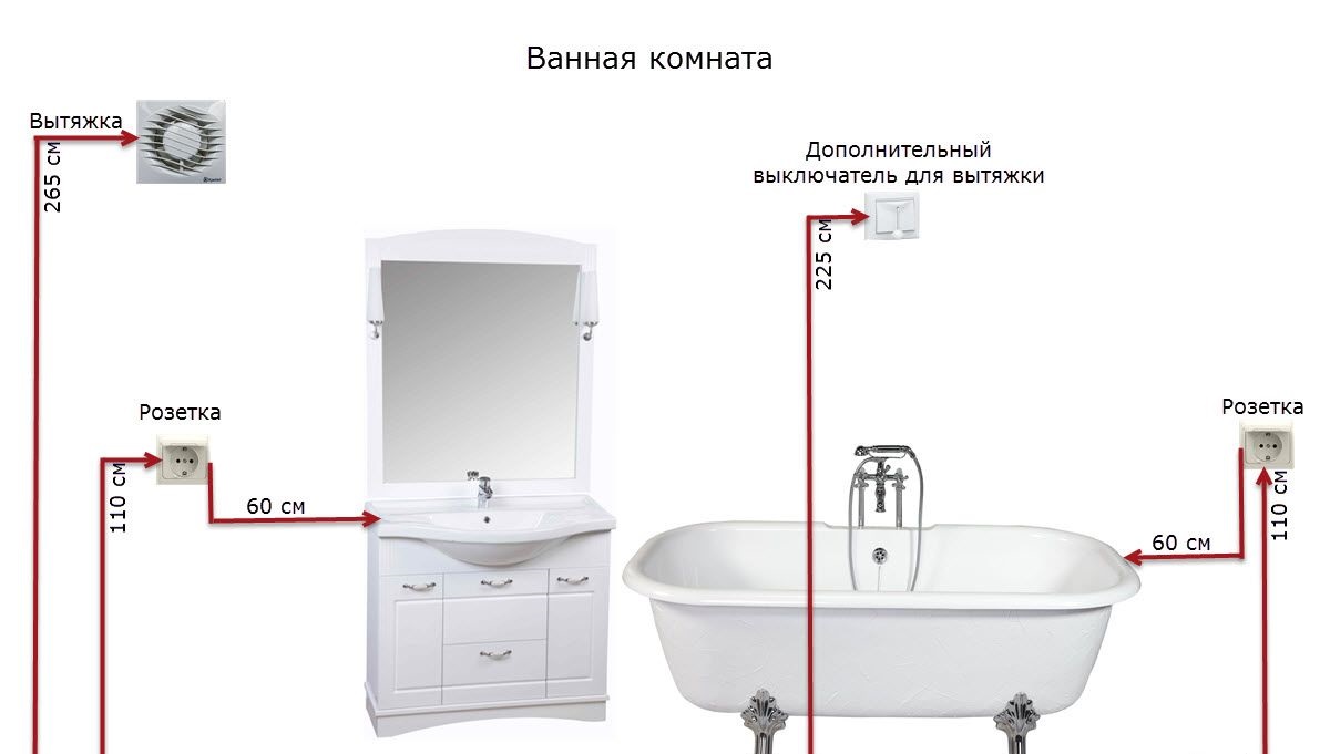 Dans la salle de bain, un lave-linge, une douche et un chauffe-eau peuvent être branchés en permanence. Souvent, vous devez utiliser un sèche-cheveux ou un rasoir. Les gros équipements nécessiteront des sources d'énergie distinctes qui, selon les règles, doivent être situées à moins de 60 cm de la source d'eau et du sol. Vous devriez acheter des douilles spéciales étanches à l'humidité avec un couvercle et un marquage IP44 - elles ont une bride en plastique spéciale à l'intérieur pour l'évacuation de l'eau lorsqu'elles sont touchées.