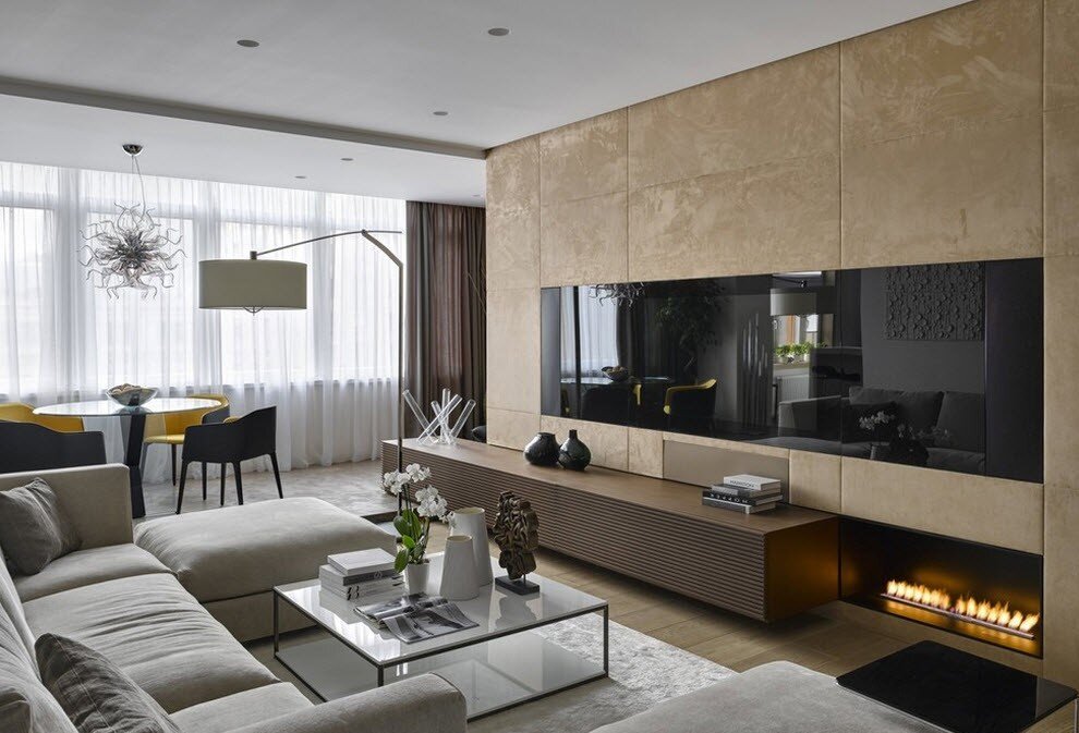 Vous pouvez étendre le territoire en combinant la pièce et la cuisine. Cette méthode convient à une famille de trois personnes et permet à chacun de mettre en valeur un coin personnel. Une table à manger cosy située à l'emplacement de l'ancien mur permettra à chacun de se retrouver.
