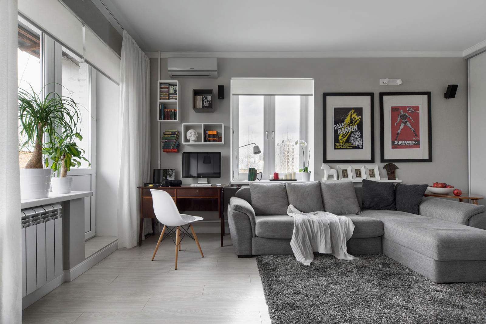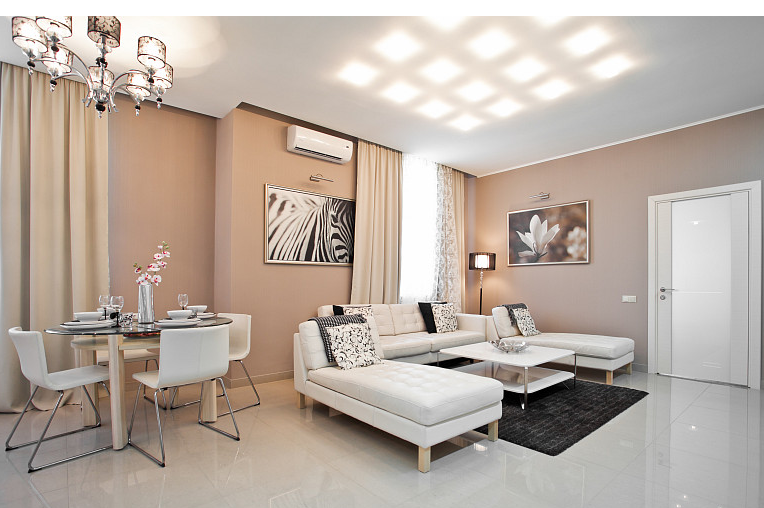 - le salon et la chambre adjacente sont équipés de la même manière que dans la variante avec un appartement de deux pièces - ils accrochent un climatiseur d'une puissance allant jusqu'à 4,5 kW au-dessus de la porte du hall;