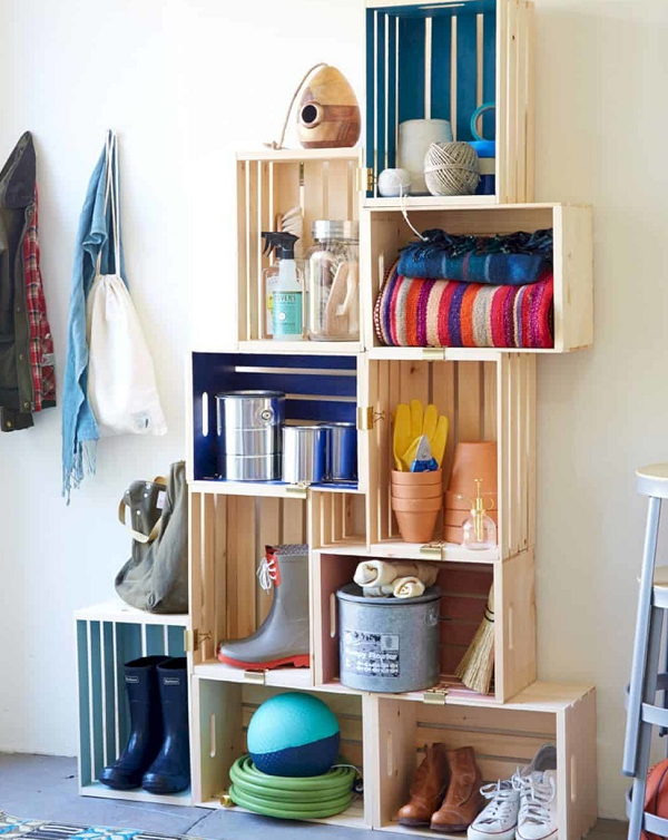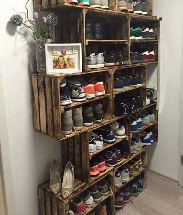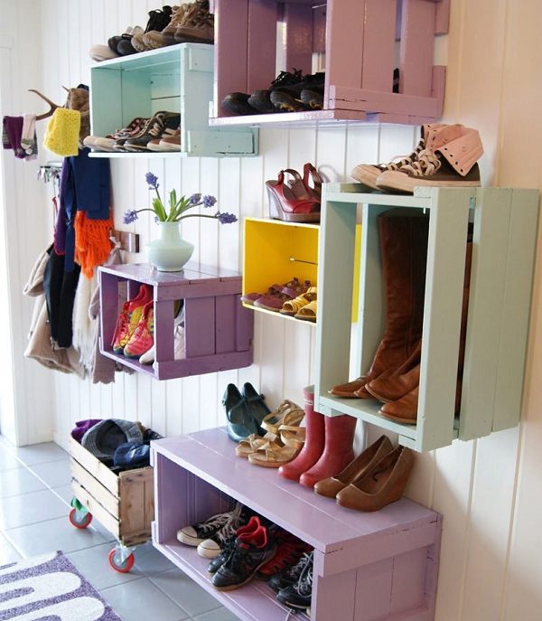 À partir de conteneurs en bois, vous pouvez rendre non seulement confortable, mais aussi un beau cintre. Un placard intégré est utile pour ranger un grand nombre de chaussures.