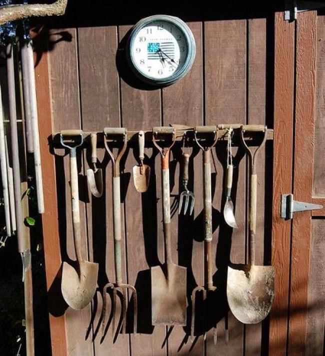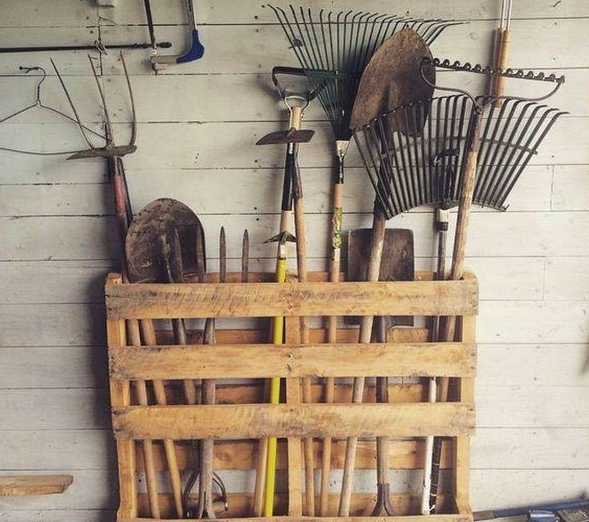 Outils de jardin - outils pour les résidents d'été. Pour accueillir pelles, râteaux, fourches et balais, ils proposent des sous-verres et des organisateurs originaux. À partir des planches, vous pouvez construire votre propre construction dans la grange ou sur n'importe quel endroit libre du site.