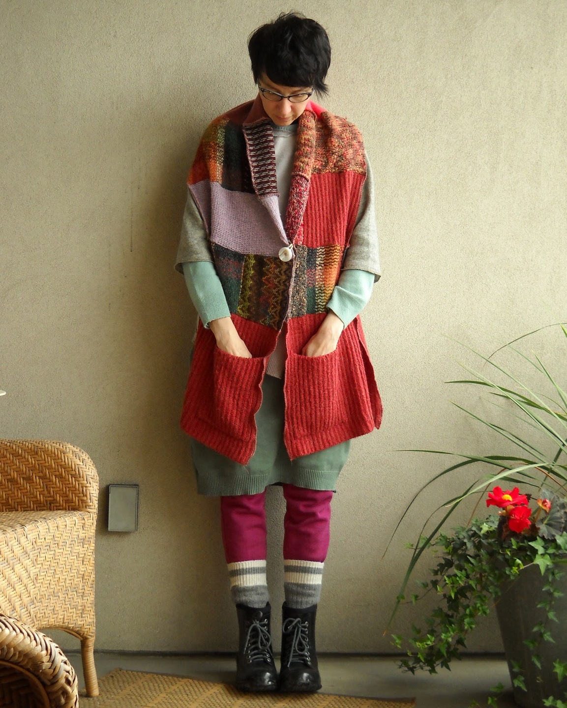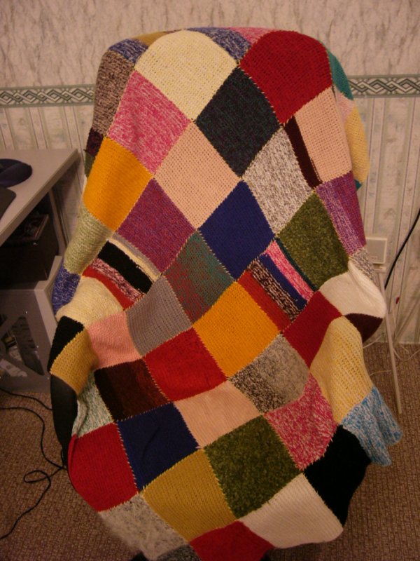 En utilisant la technique du patchwork, vous pouvez collecter un plaid à partir des restes de pulls usés. Certes, il est nécessaire de connecter les pièces manuellement pour saisir doucement toutes les boucles ouvertes.
