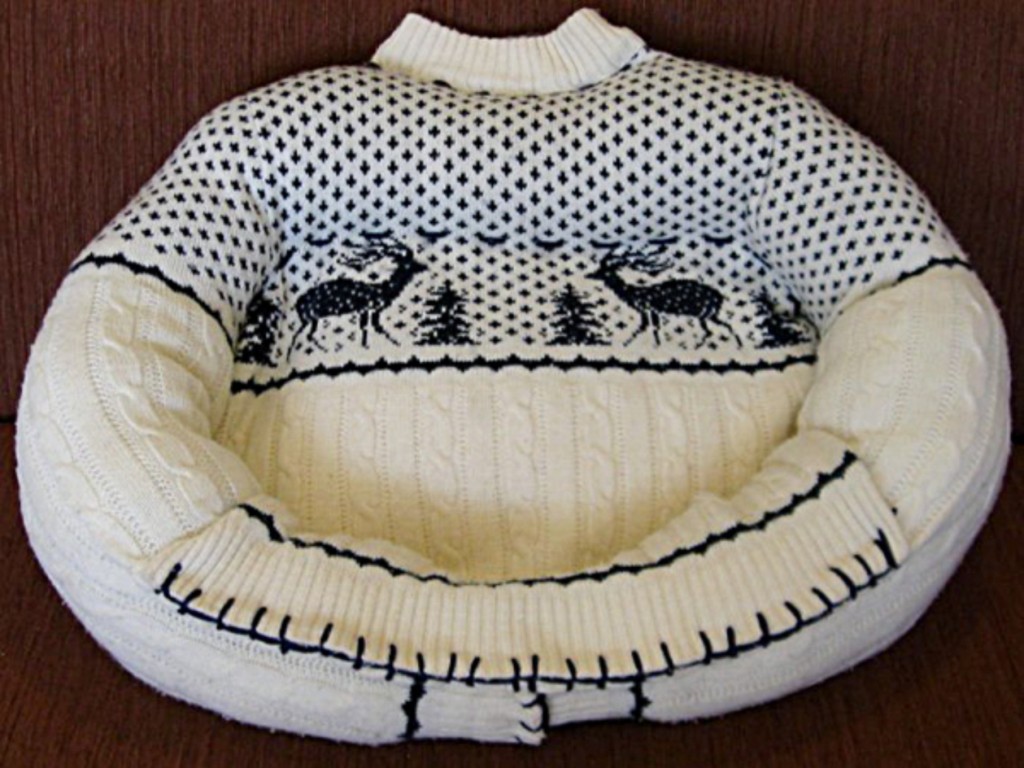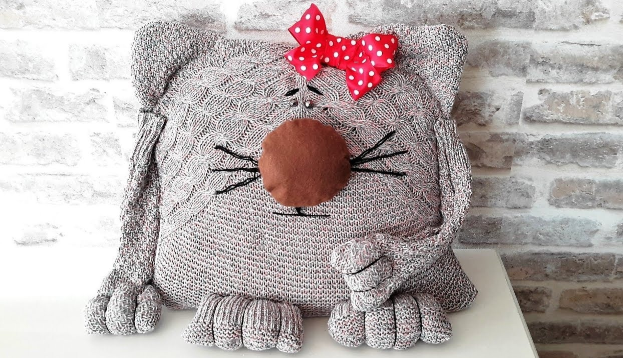 Pour faire un oreiller de vos propres mains, vous devez choisir le dos d'un beau pull, puis en former la forme souhaitée, le remplir de sintepon et le coudre.