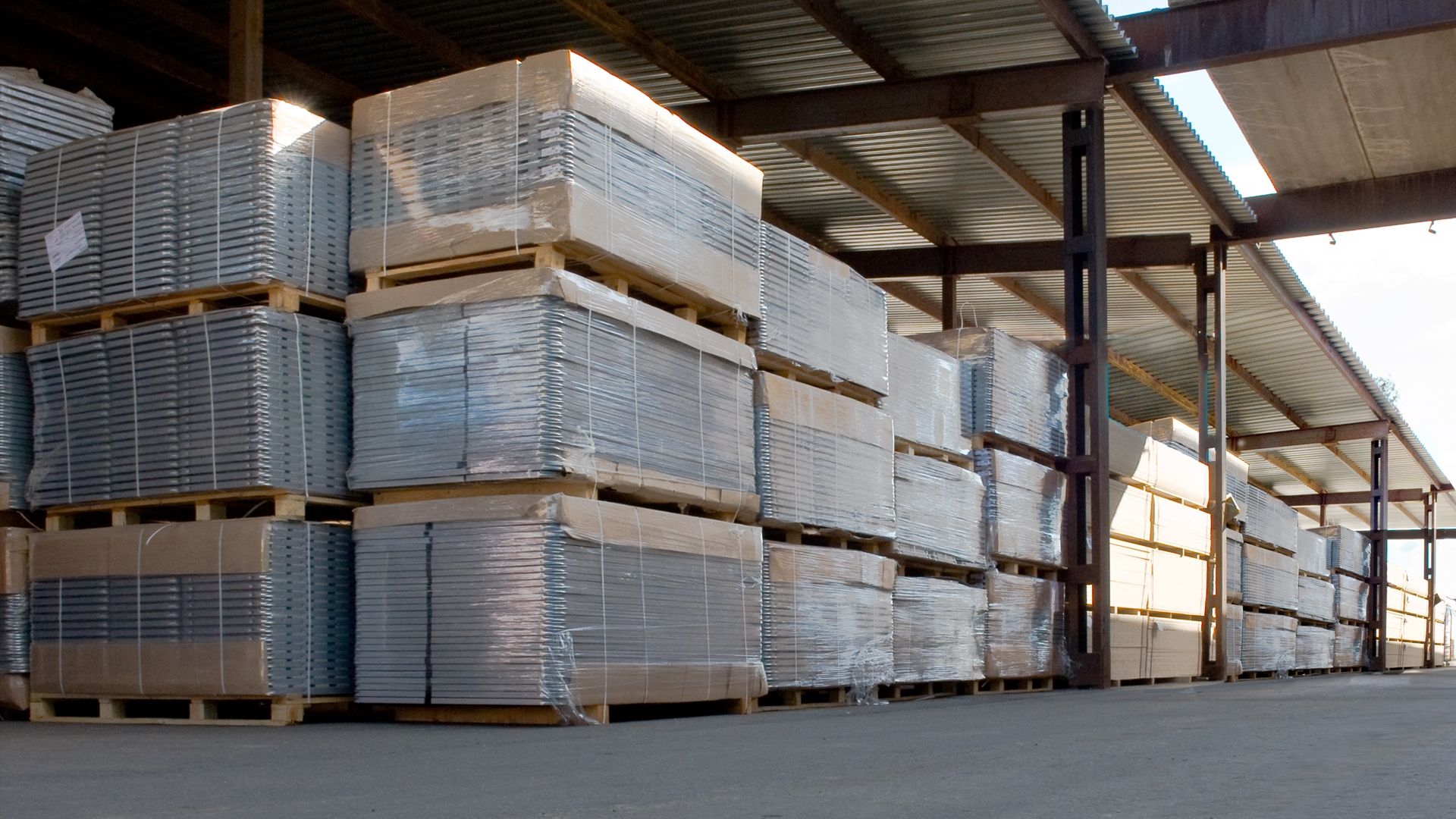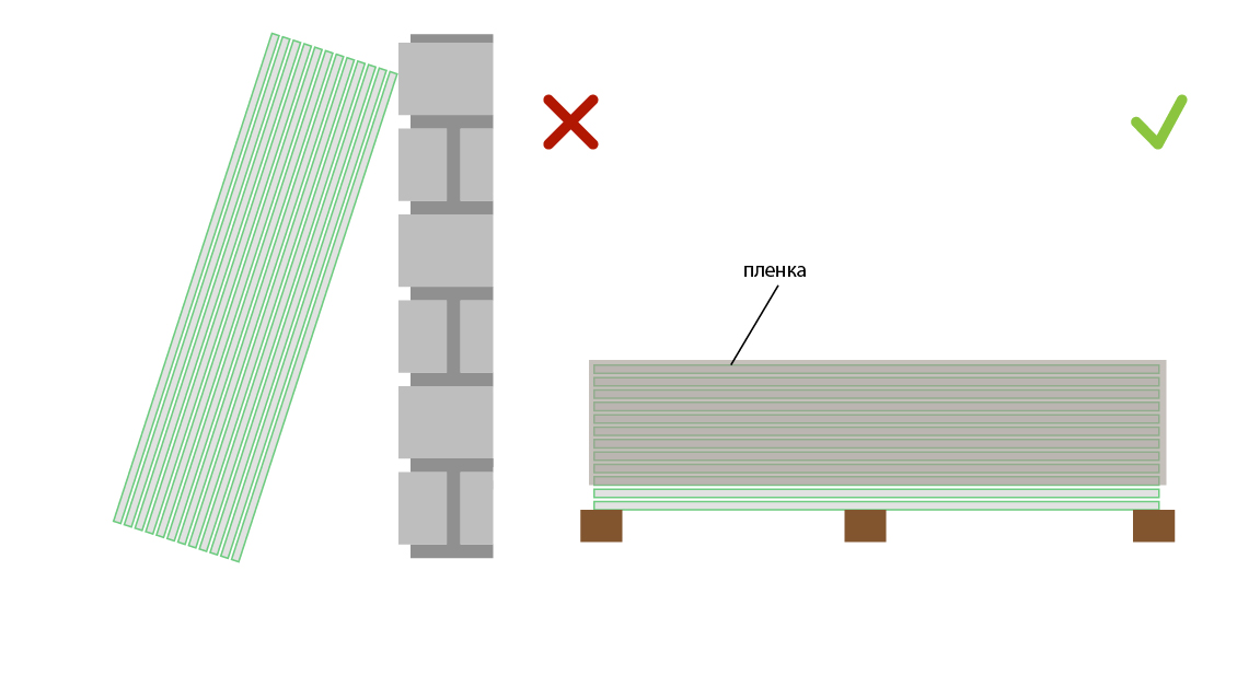 S'il n'y a pas de palettes ou autre support à proximité, vous pouvez placer une cloison sèche scellée sur le sol, en plaçant plusieurs couches de film en dessous. Une poutre à crémaillère convient également comme support. Il doit être placé le long des feuilles avec une distance entre les planches ne dépassant pas 30–40 cm, de sorte que le poids de l'emballage soit uniformément réparti.