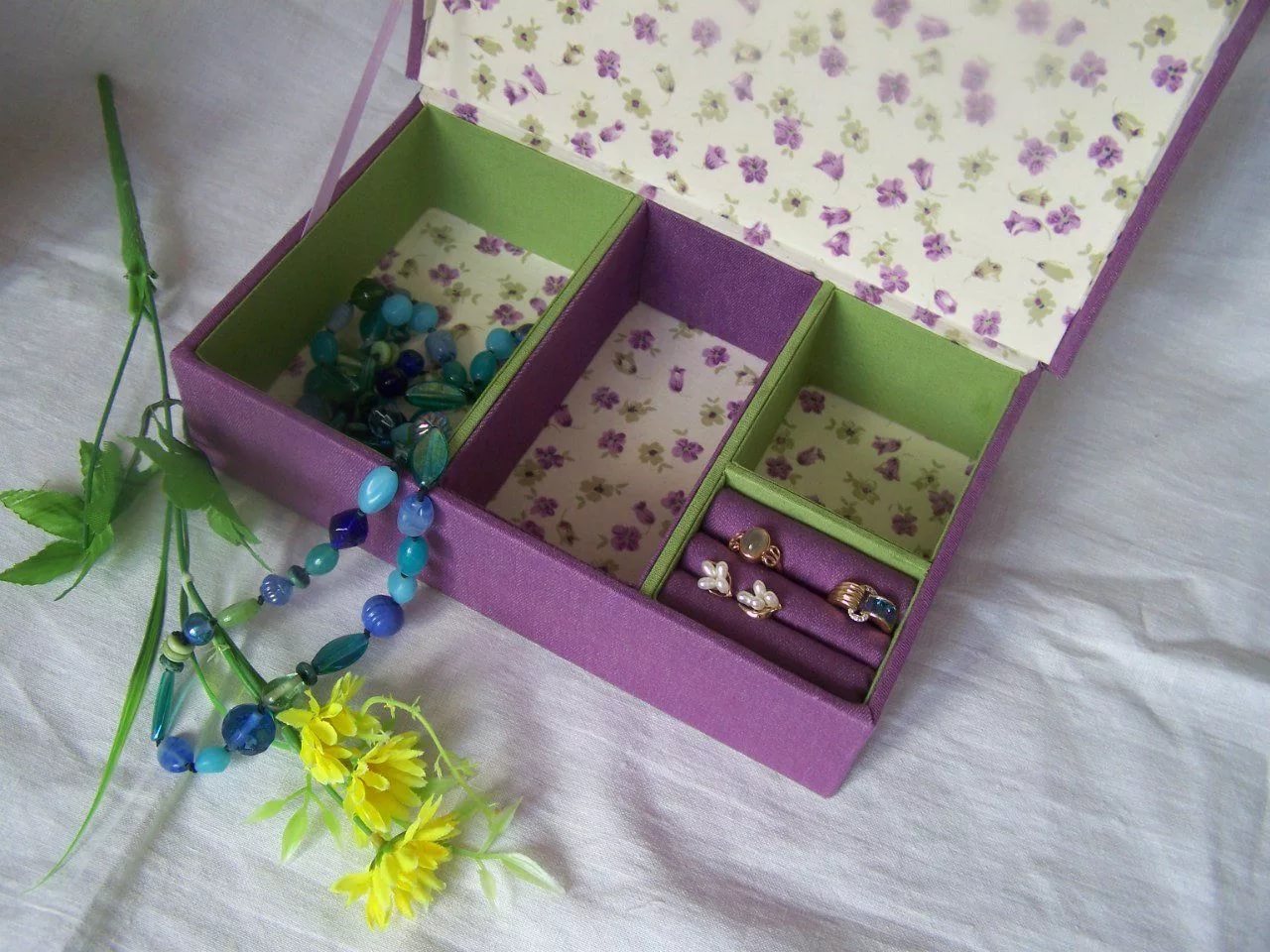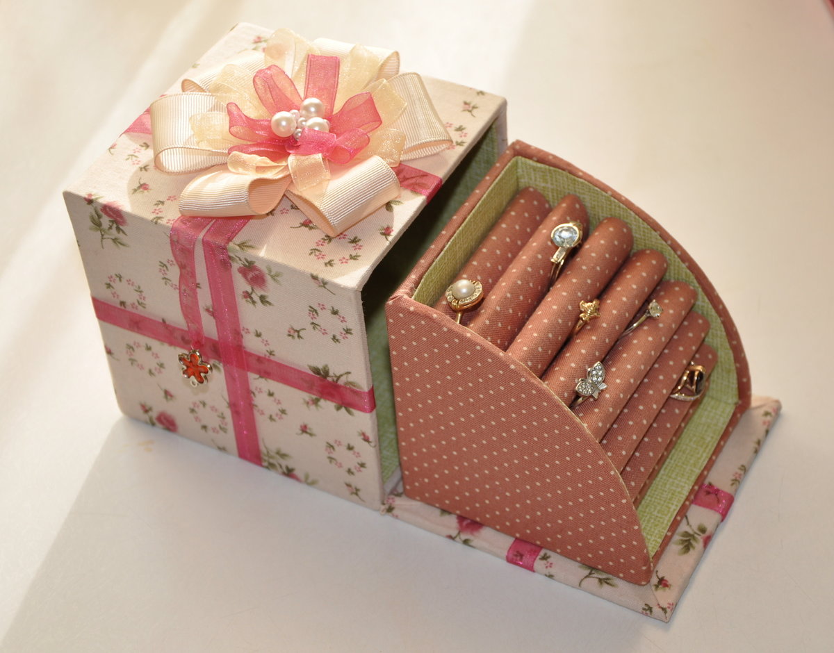 Pour stocker des bijoux, vous pouvez fabriquer des cercueils spectaculaires à partir d'un emballage de chaussures durable. Pour rendre le produit plus attrayant, il est collé avec un tissu coloré ou décoré de rubans et de dentelle.