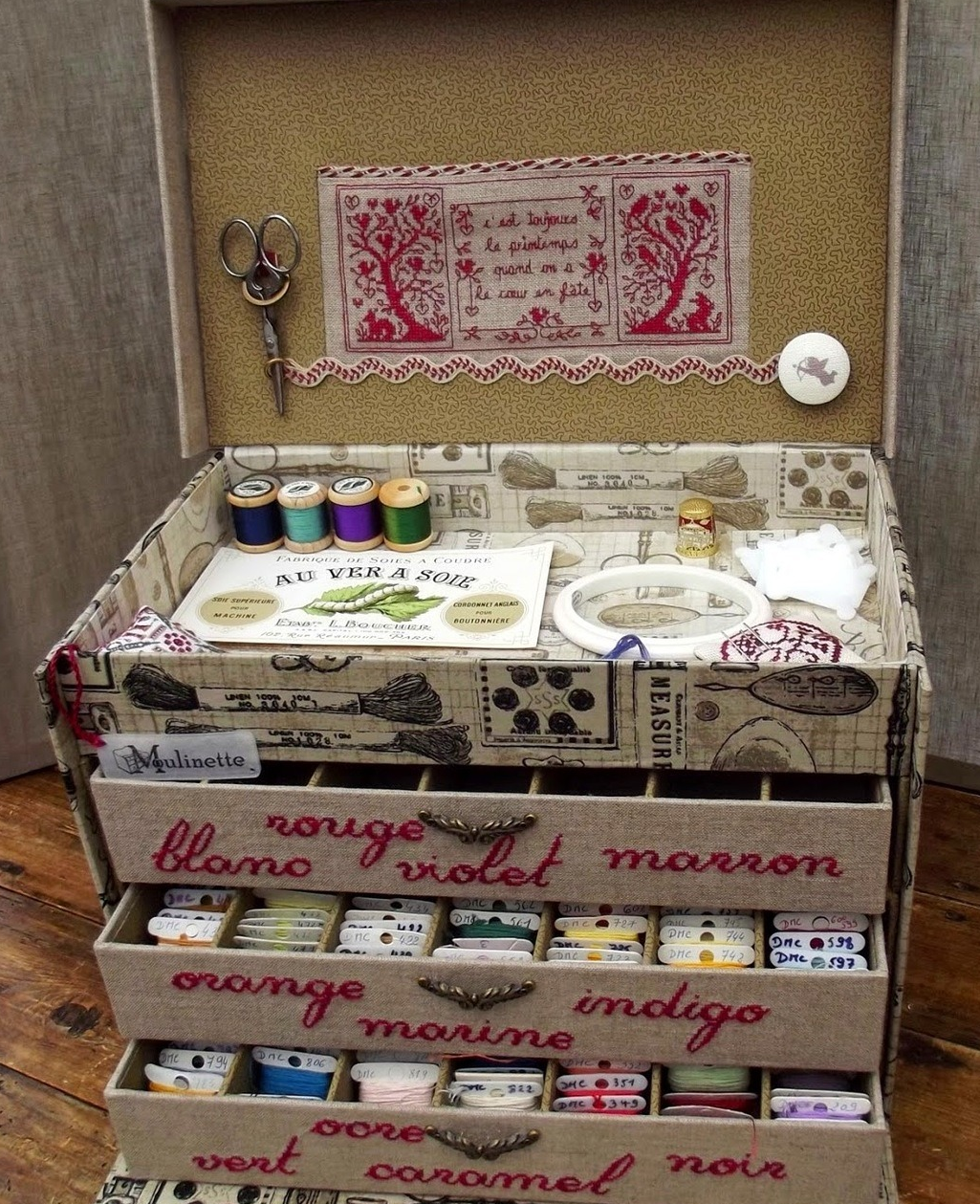 Si vous planifiez l'espace intérieur du produit en fonction des besoins de la couturière, vous obtiendrez un excellent organisateur pour les accessoires de couture. Dans une petite boîte, vous pouvez mettre l'essentiel et dans un design solide - accessoires d'une couturière professionnelle.
