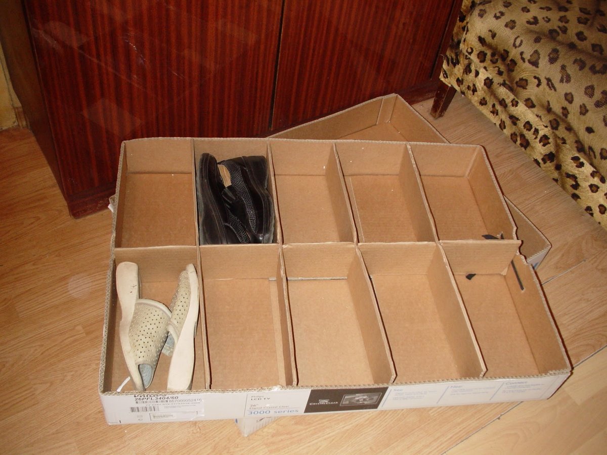 Les chaussures seront soigneusement posées et faciles à trouver si vous créez une boîte pratique pour le stockage saisonnier des chaussures et des chaussures à partir de déchets et une galoshnik dans le couloir.