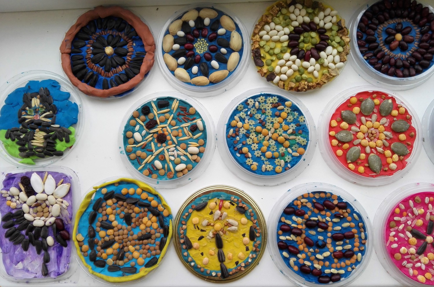 La base du travail peut servir d'assiettes, de plats ou de tout autre objet plat recouvert de pâte à modeler, qui servira de colle. Les enfants seront heureux de participer à la création de bricolages simples.