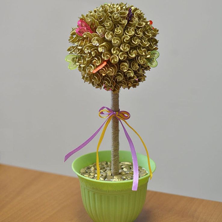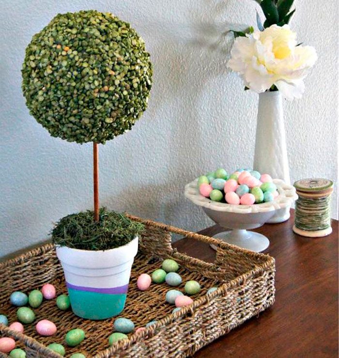 Pour décorer une table ou un rebord de fenêtre, il est facile de réaliser un «arbre» topiaire original avec une «couronne» de petits pois. Et pour la commodité de la femme au foyer - une adaptation utile pour les couteaux.