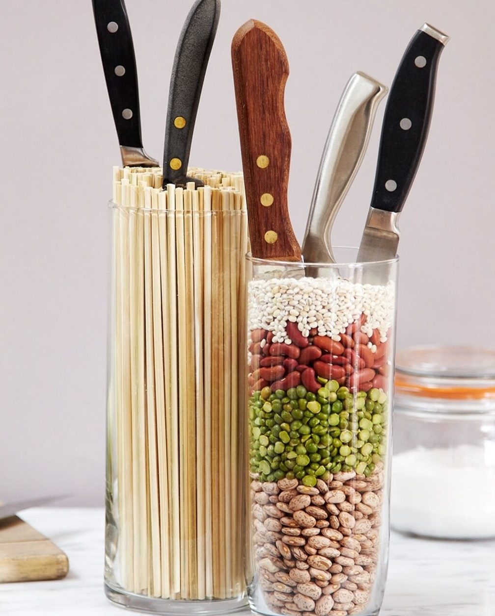 Un élément inhabituel du décor de la cuisine peut être des céréales colorées, versées dans des récipients en verre. La combinaison de nuances est choisie par les auteurs. L'essentiel est que les rayures lumineuses soient pittoresques.