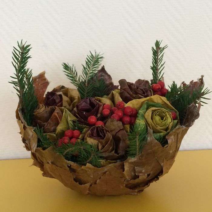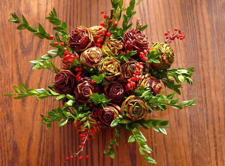 Avec suffisamment d'effort, il est facile d'apprendre la technique de fabrication des couleurs originales. Une rose est collectée à partir de feuilles molles du noyau, sur lesquelles des «pétales» sont progressivement ajoutés, en les attachant avec des fils. Le produit est séché au sèche-cheveux et peint à votre goût. Un tel cadeau ravira même les amateurs de bouquets vivants.