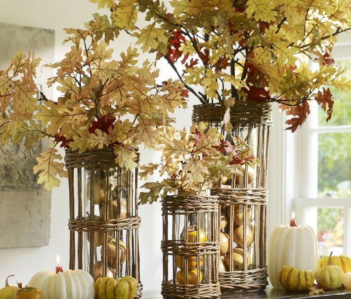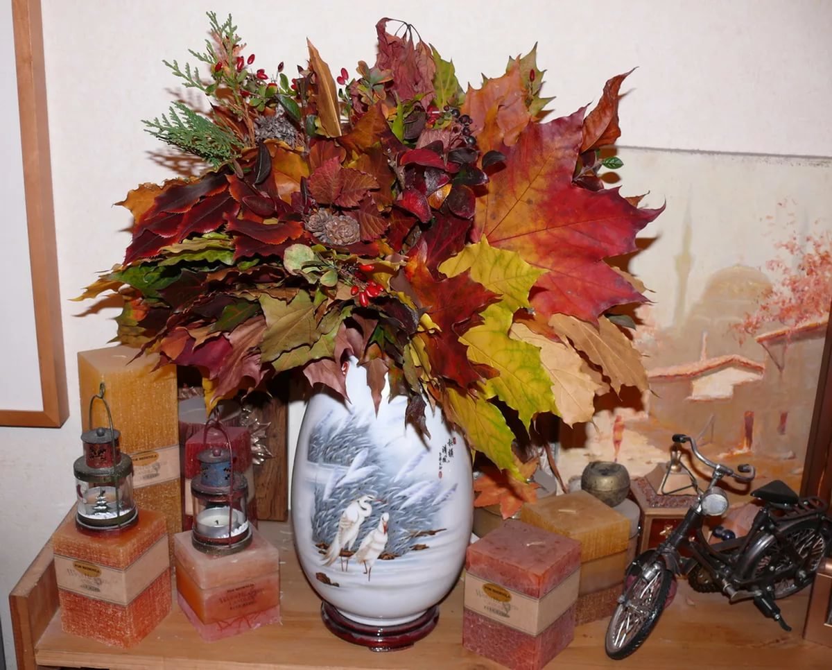Faire un "bouquet" coloré de feuilles d'automne ne nécessitera pas de préparation particulière. Il suffit d'installer les branches que vous aimez dans n'importe quel navire spectaculaire. Et pour que le décor plaise aux yeux pendant longtemps, le vase est rempli d'un mélange d'eau avec de la glycérine, qui doit être ajoutée à mesure qu'elle s'évapore.