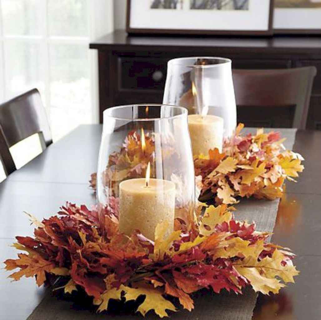 Les couleurs chaudes du feuillage d'automne soulignent la douce lumière des lanternes vivantes avec des bougies dans des récipients en verre de toute forme.