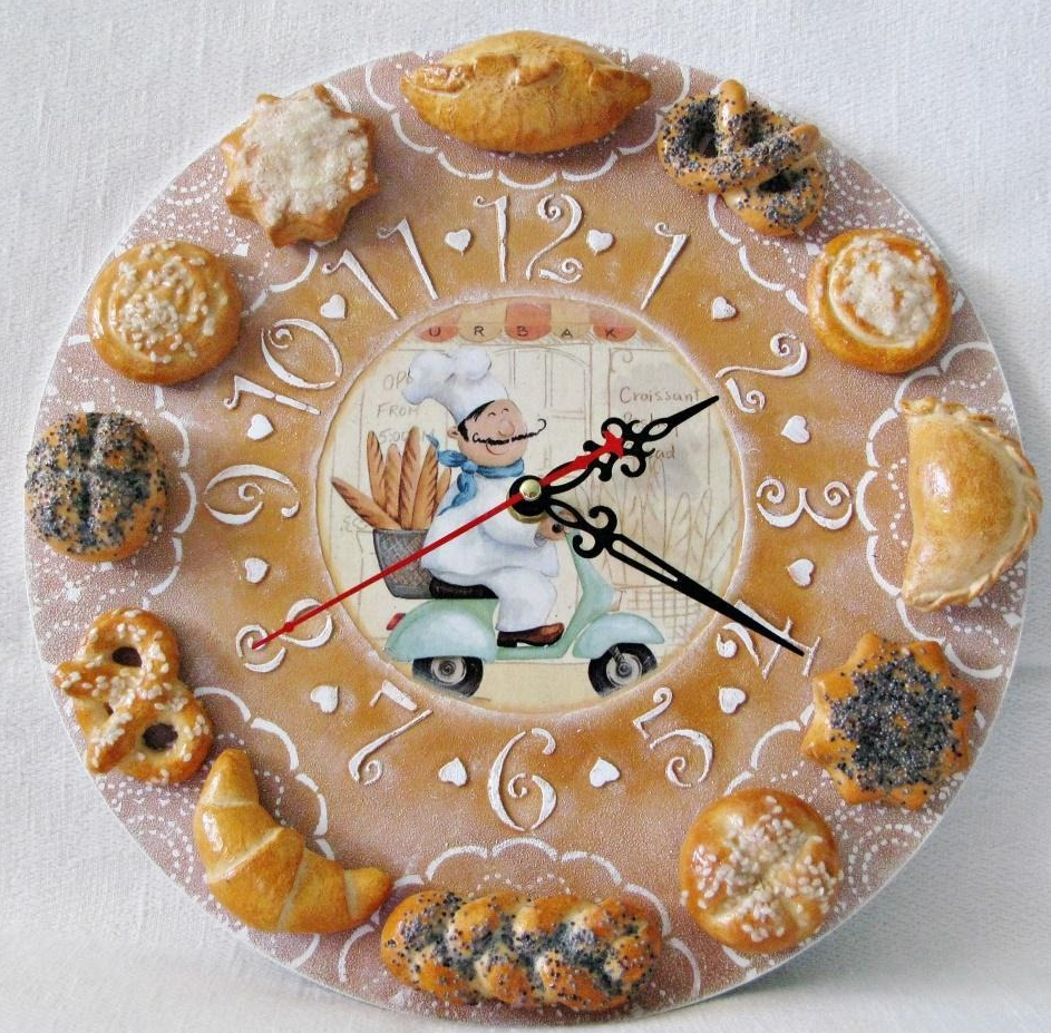 Travailler avec de l'argile polymère nécessite des capacités artistiques, de la précision, de la patience et de la persévérance. Par conséquent, un débutant devrait commencer avec des formes simples, et ensuite seulement procéder à la création de «couleurs» pittoresques. Le mécanisme d'horloge étant installé dans une pièce encore humide, vous devez utiliser des matières premières qui ne nécessitent pas de cuisson au four, mais durcissent en quelques jours à température ambiante.