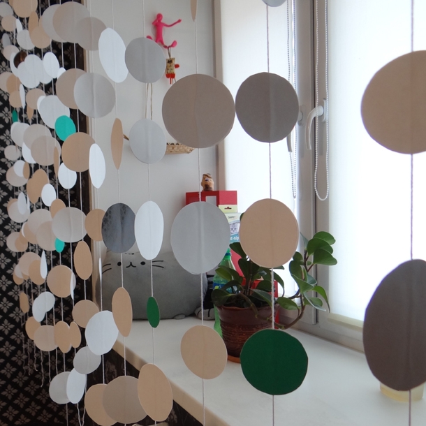 Le papier n'est pas un matériau très durable, mais des cercles et des fleurs brillants sur une ficelle ou du ruban de papier seront une décoration festive des fenêtres d'une chambre d'enfant. Ces métiers sont facilement mis à jour, et leur apparence et leur bruissement gai plairont vraiment aux enfants.