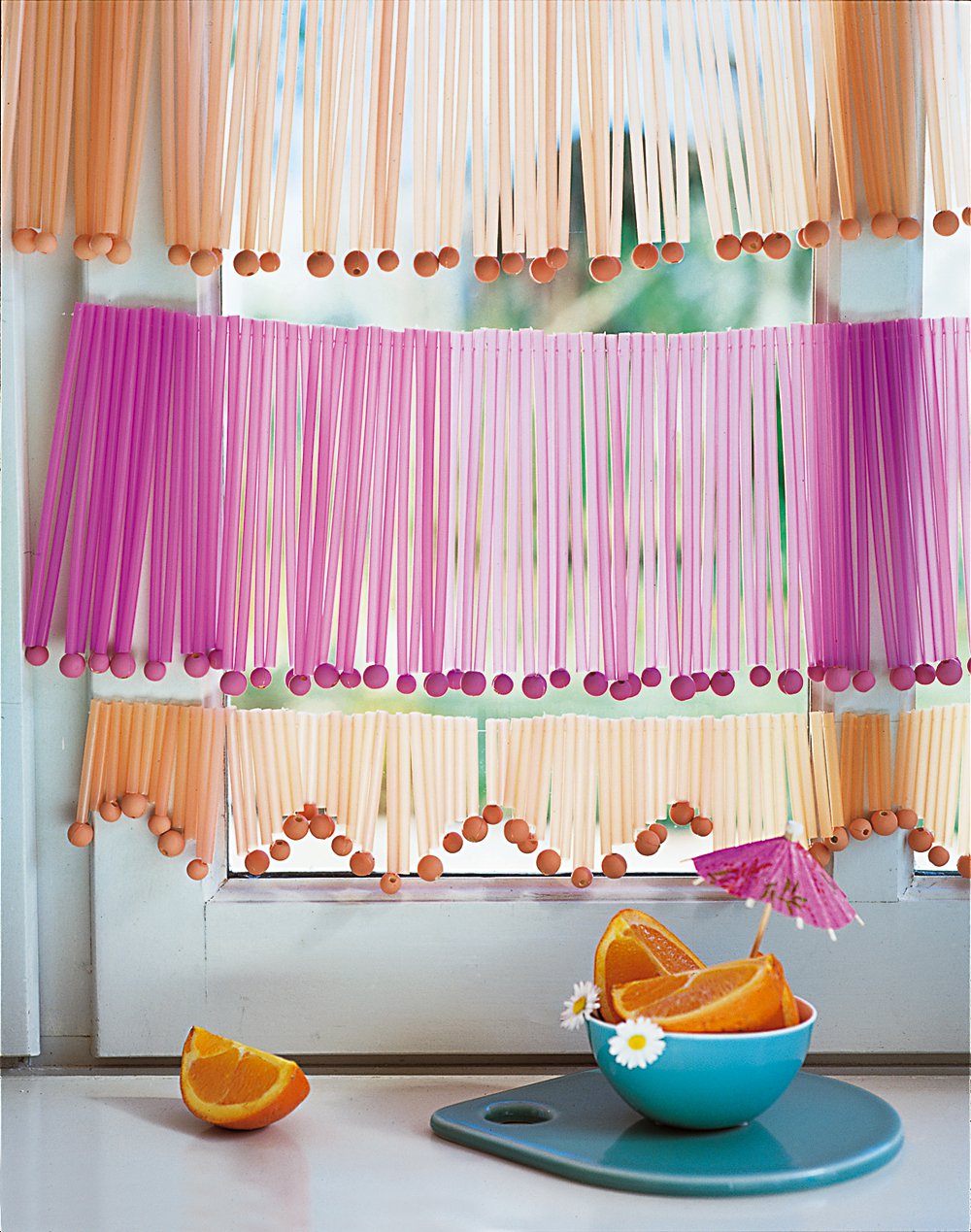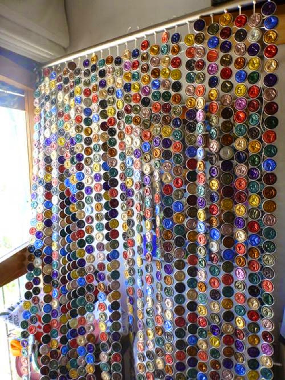 Des perles de différentes formes et tailles, en verre, plastique, bois, cristal, sont vendues et peuvent être utilisées pour créer de joyeux rideaux-pendentifs.
