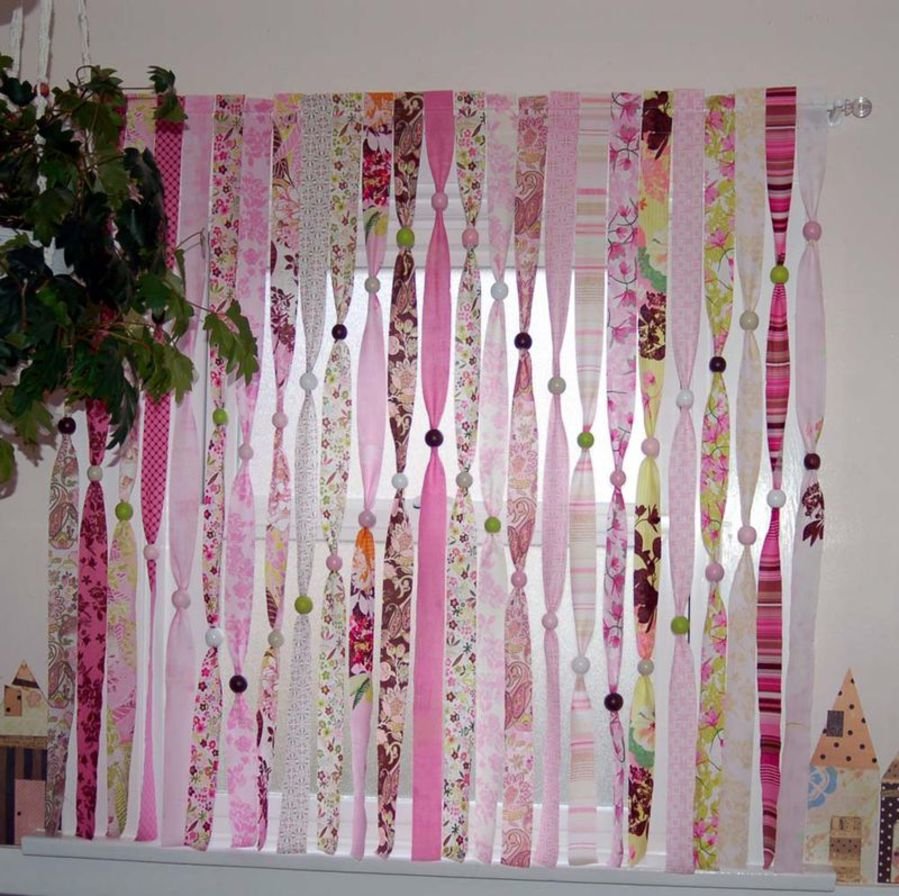 Les textiles peuvent être fabriqués de leurs propres mains, ayant peu de compétences pour travailler sur une machine à coudre. Et il n'est pas nécessaire de coudre les rubans colorés offerts par les entreprises commerciales - il suffit de choisir une palette de couleurs spectaculaire, de les lisser et de les fixer sur la corniche. Les rideaux en apesanteur peuvent être lestés à l'aide de boules en bois au bas du produit.