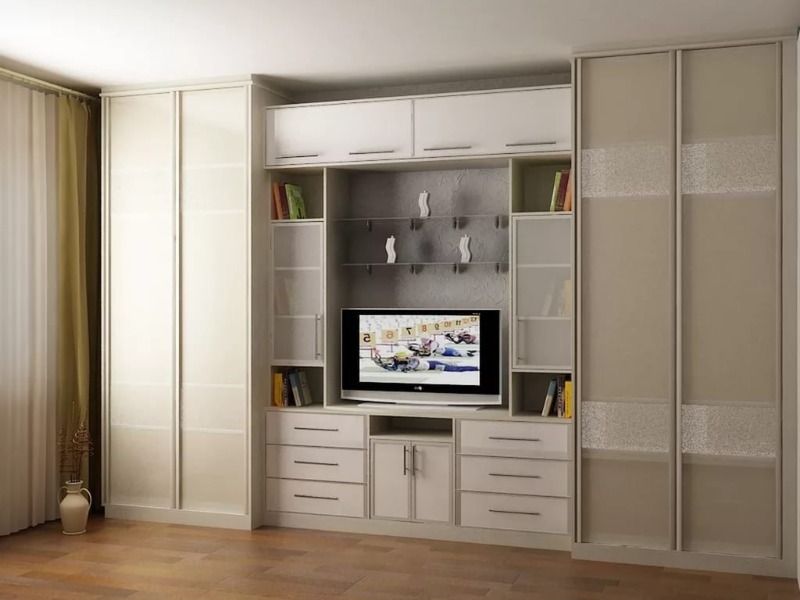 - Dans le salon, les espaces de rangement, contrairement aux chambres, sont ouverts. Ce sont des niches, des vitrines, des étagères pour les livres et les souvenirs. Faites étalage de belles choses importantes pour le propriétaire des choses de l'appartement, des photos de famille.