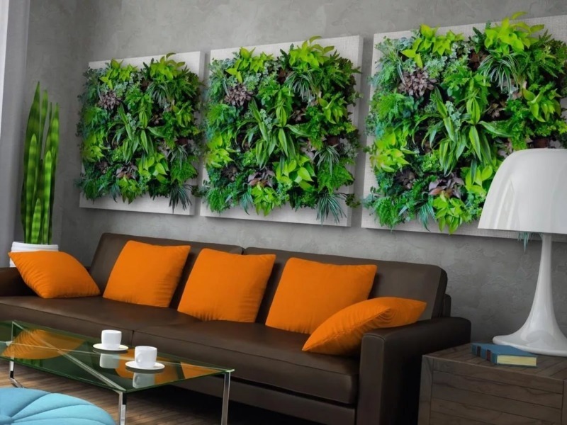 Pour le style moderne, une solution fraîche est un phytowall. Il s'agit d'un type de jardinage vertical pour lequel des succulentes, des vignes et de la mousse stabilisée sont utilisées. Une autre option est le florarium. Il s'agit d'une composition décorative de plantes, de galets, de sable coloré, placée dans un récipient en verre transparent de forme ronde, carrée ou complexe.