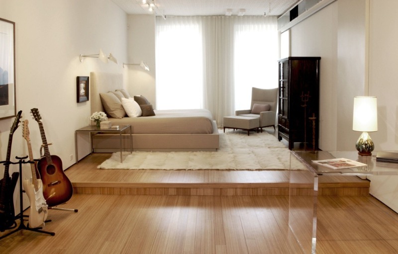 Augmenter (abaisser) le sol un peu dans la pièce est une autre solution intéressante afin d'obtenir de l'espace utilisable supplémentaire dans un appartement d'une pièce. Souvent, un podium est utilisé pour un tel zonage.Il vous permet de diviser la pièce en deux parties en raison de différentes hauteurs de plancher. Vous pouvez mettre un lit sur le podium. Avantages de conception: